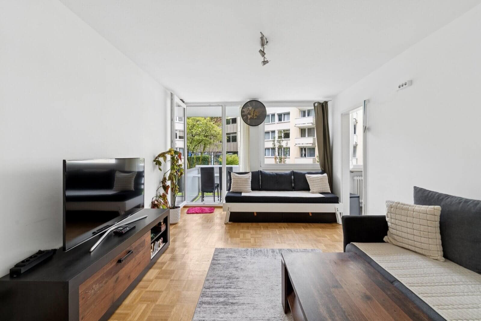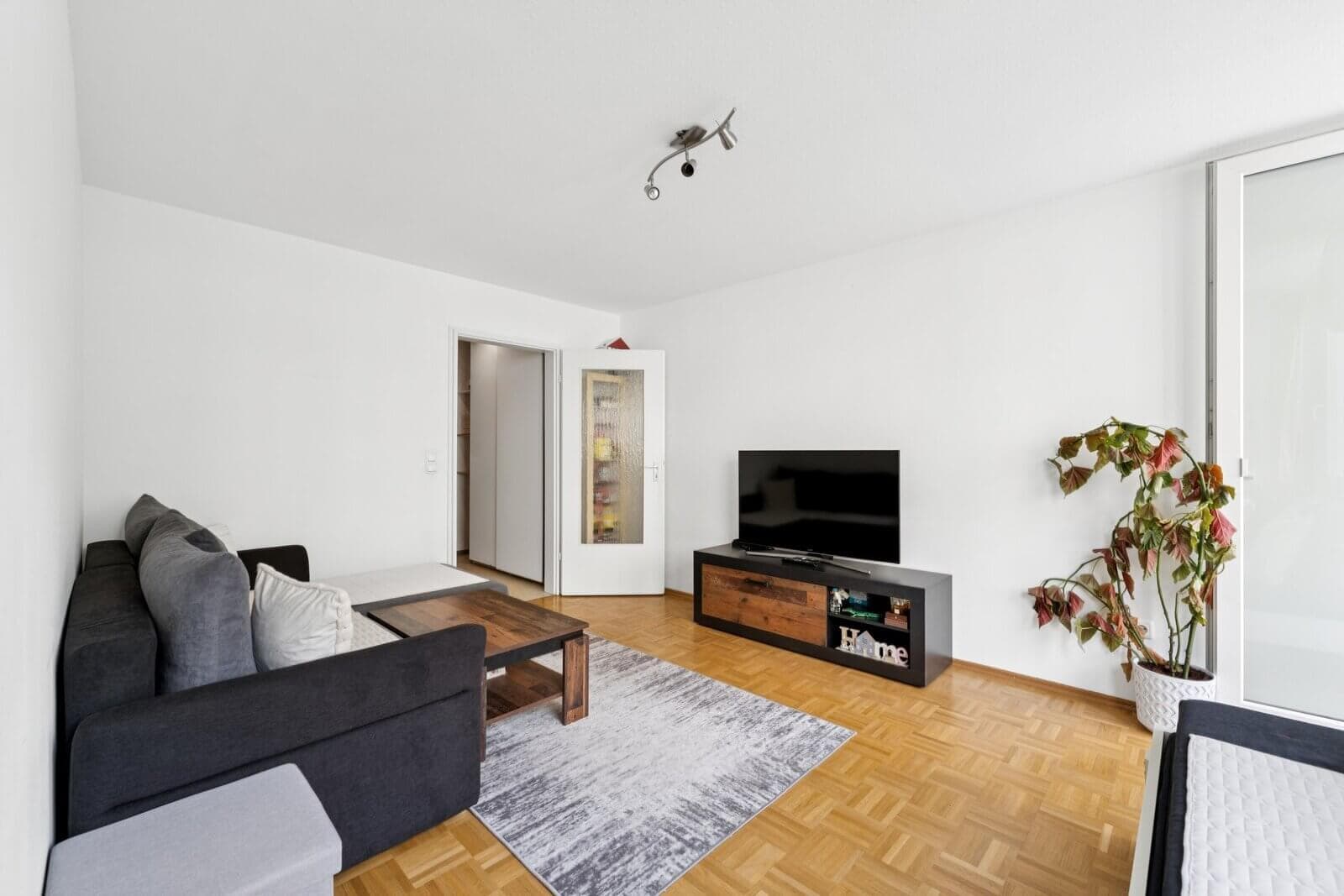 The apartment has classic strip parquet flooring in the living area and tiles in the bathroom and kitchen. The compact bathroom has a shower. The separate kitchen makes it easy to use or rent out.
