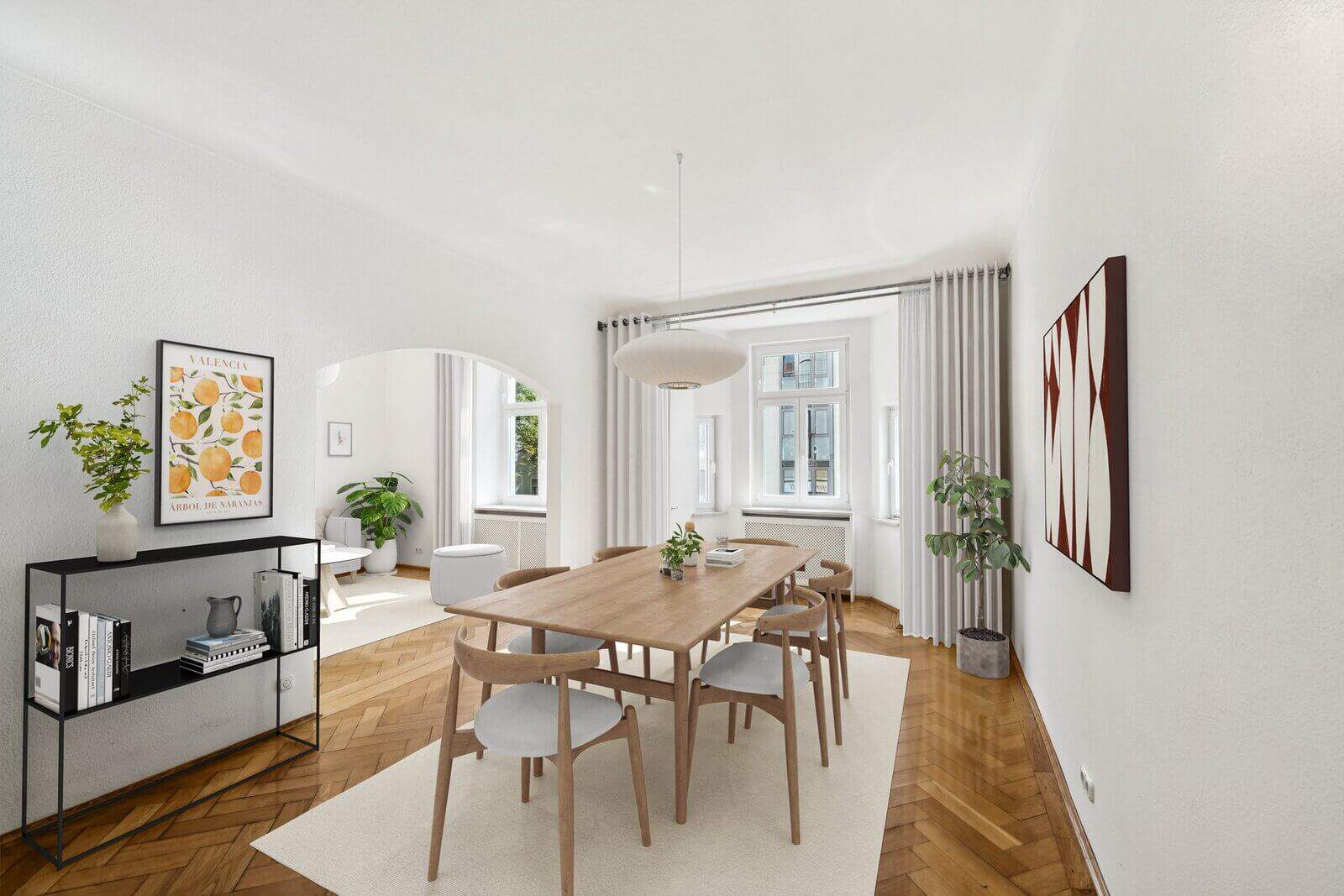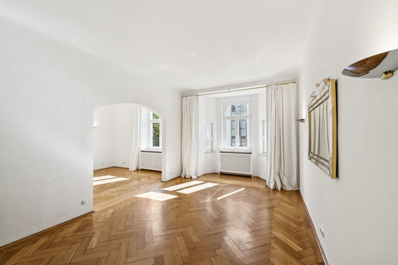 The apartment is located on the first floor of a well-maintained apartment building. Classic old-building charm unfolds across approx. 112 sqm : ceiling heights of up to approx. 3.5 m, elegant herringbone parquet flooring, and select historical details.