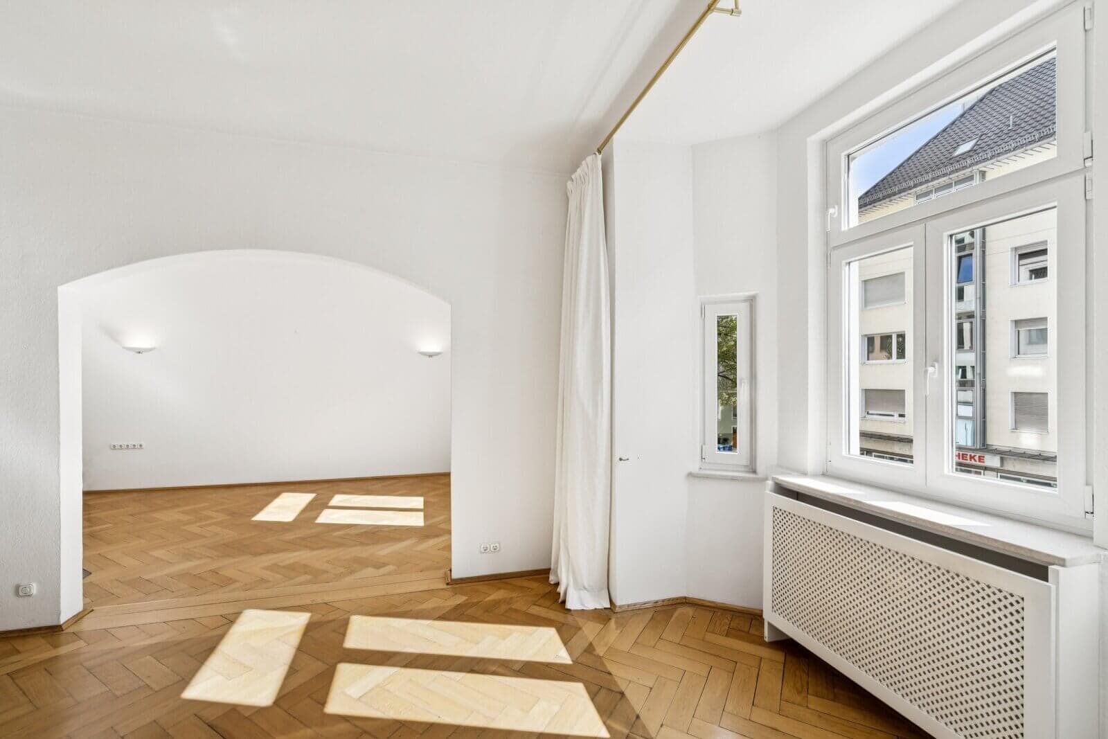 The living and dining area is connected by a stylish arched doorway and impresses with herringbone parquet flooring, a bay window, and modernized windows—the impressive ceiling height is particularly striking here. The living room has a decorative fireplace, for which a technical solution for reactivation is currently being sought. The separate kitchen offers the potential to open up to the dining area to create a modern living concept.