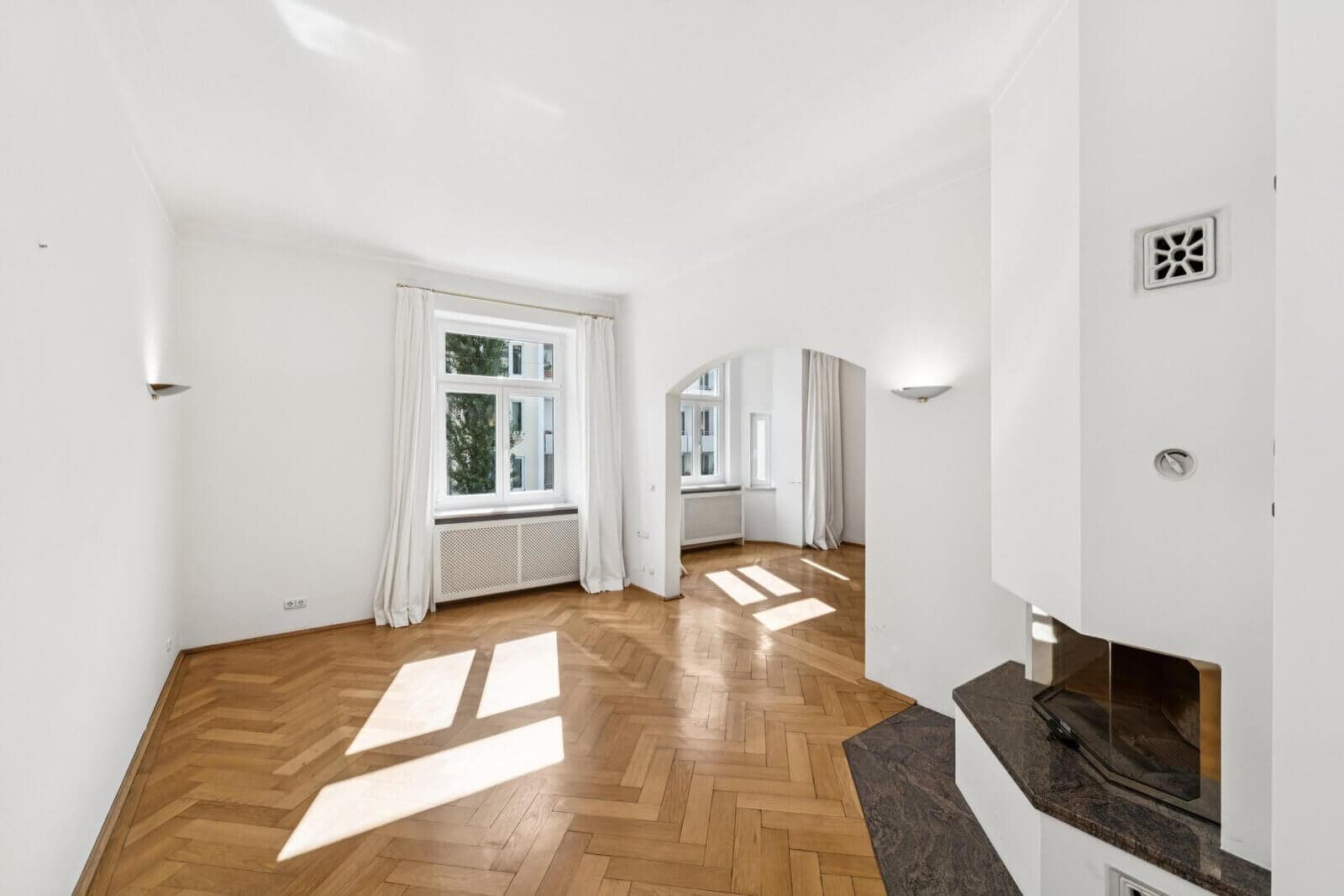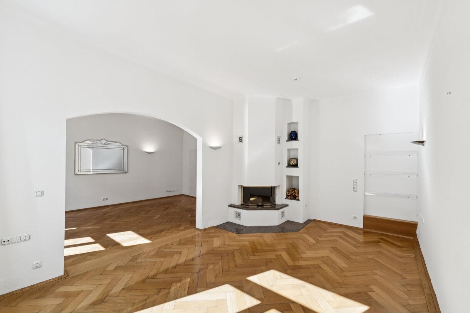 Three additional rooms offer flexible use. In the bedroom, floor-to-ceiling built-in features allow for a contemporary redesign. Another room leads to the quiet balcony facing the inner courtyard – ideal as a study, guest room, or children‘s room. The balcony itself is a rare retreat in this location.