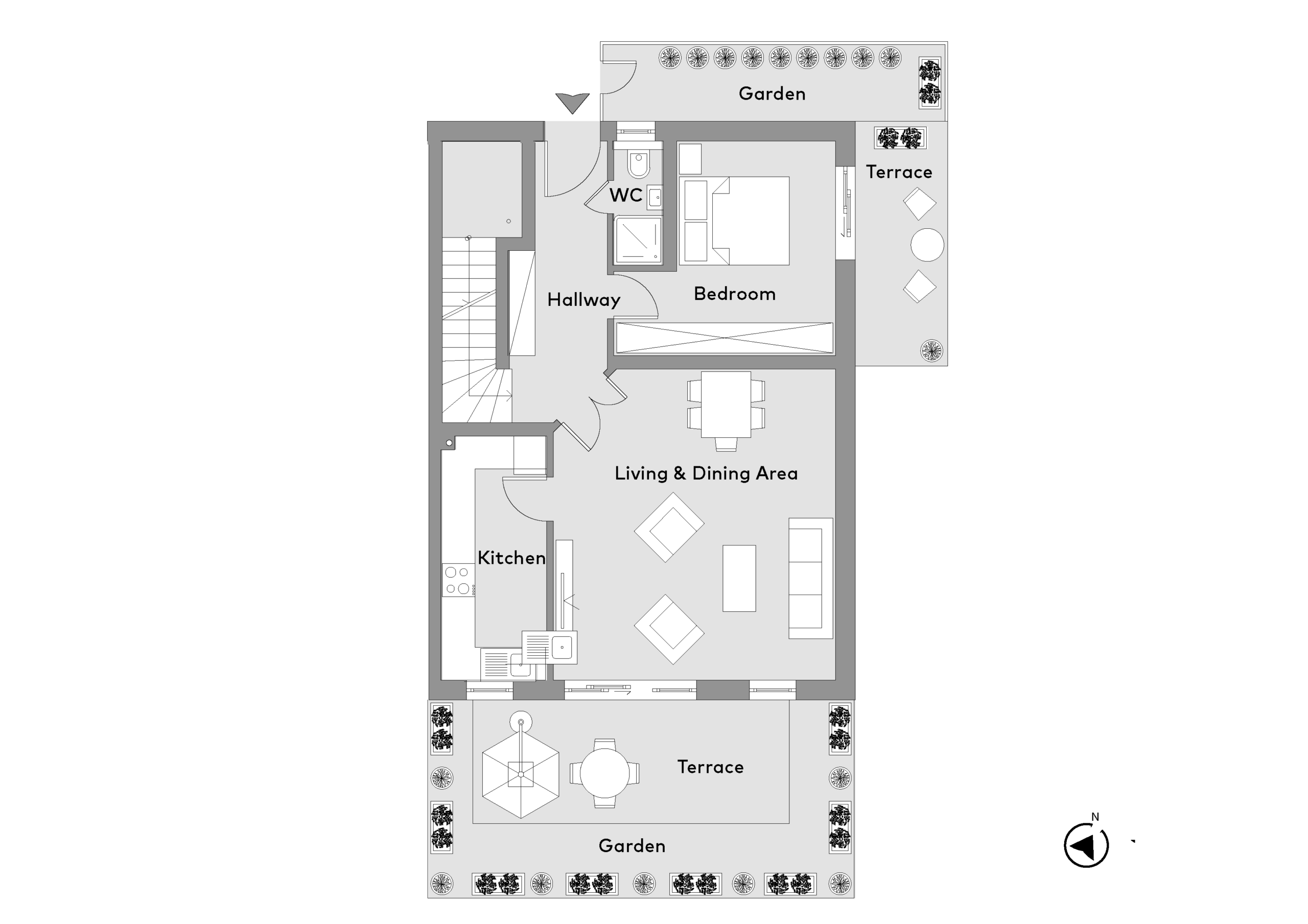 Two separate terraces with a total of approx. 50 sqm of garden space offer plenty of space for relaxing hours outdoors. The light-flooded living and dining area with direct access to the main terrace and the garden forms the heart of the apartment. The modern, separate kitchen, an elegant master bathroom with bathtub and shower and an additional guest toilet with shower offer the highest level of living comfort.