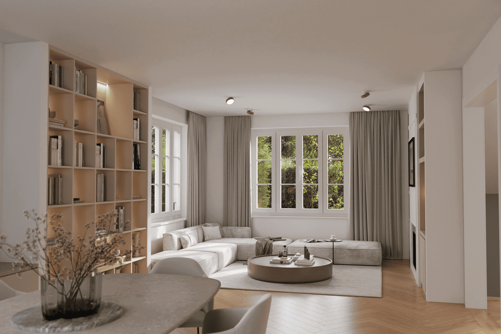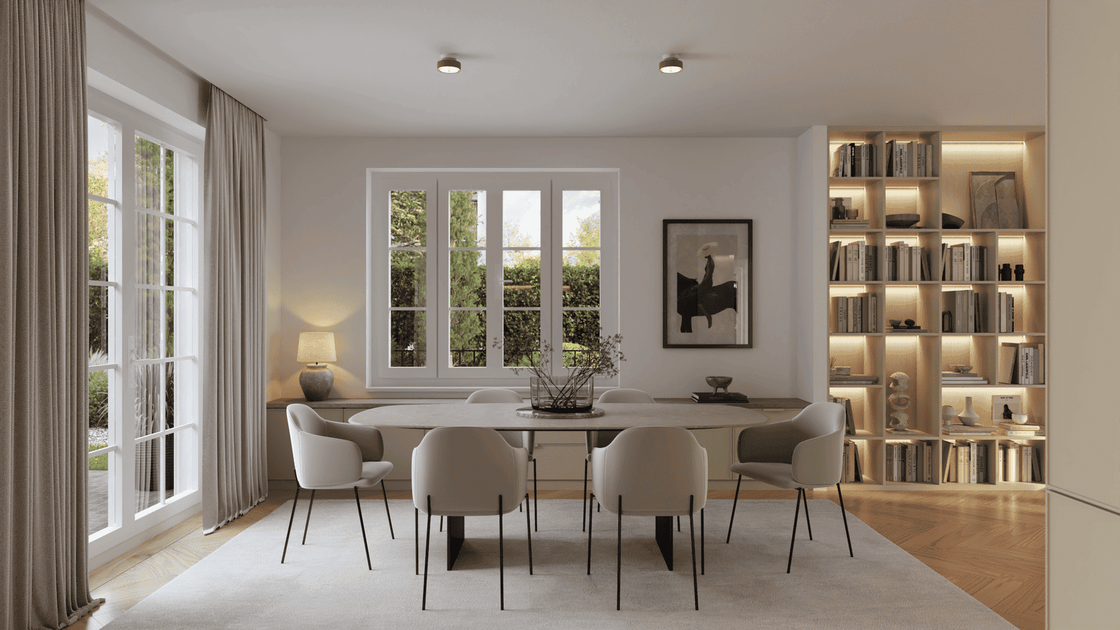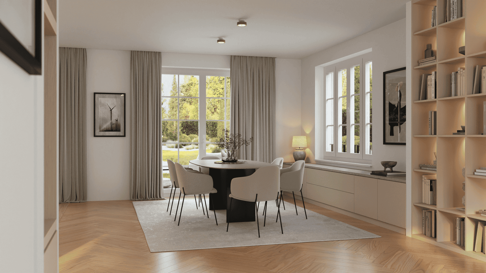 On the ground floor, you are welcomed by a spacious entrance area with a custom-made wardrobe and guest WC. The light-filled living and dining area opens up with floor-to-ceiling windows to the covered terrace and the lovingly designed expansive garden, pool, and covered patio. Noble oak parquet floors, high-quality fine stoneware tiles, and hand-plastered walls underscore the premium quality. The open kitchen is equipped with state-of-the-art features, custom-built furnishings, and high-quality branded appliances – the perfect meeting point for the whole family.