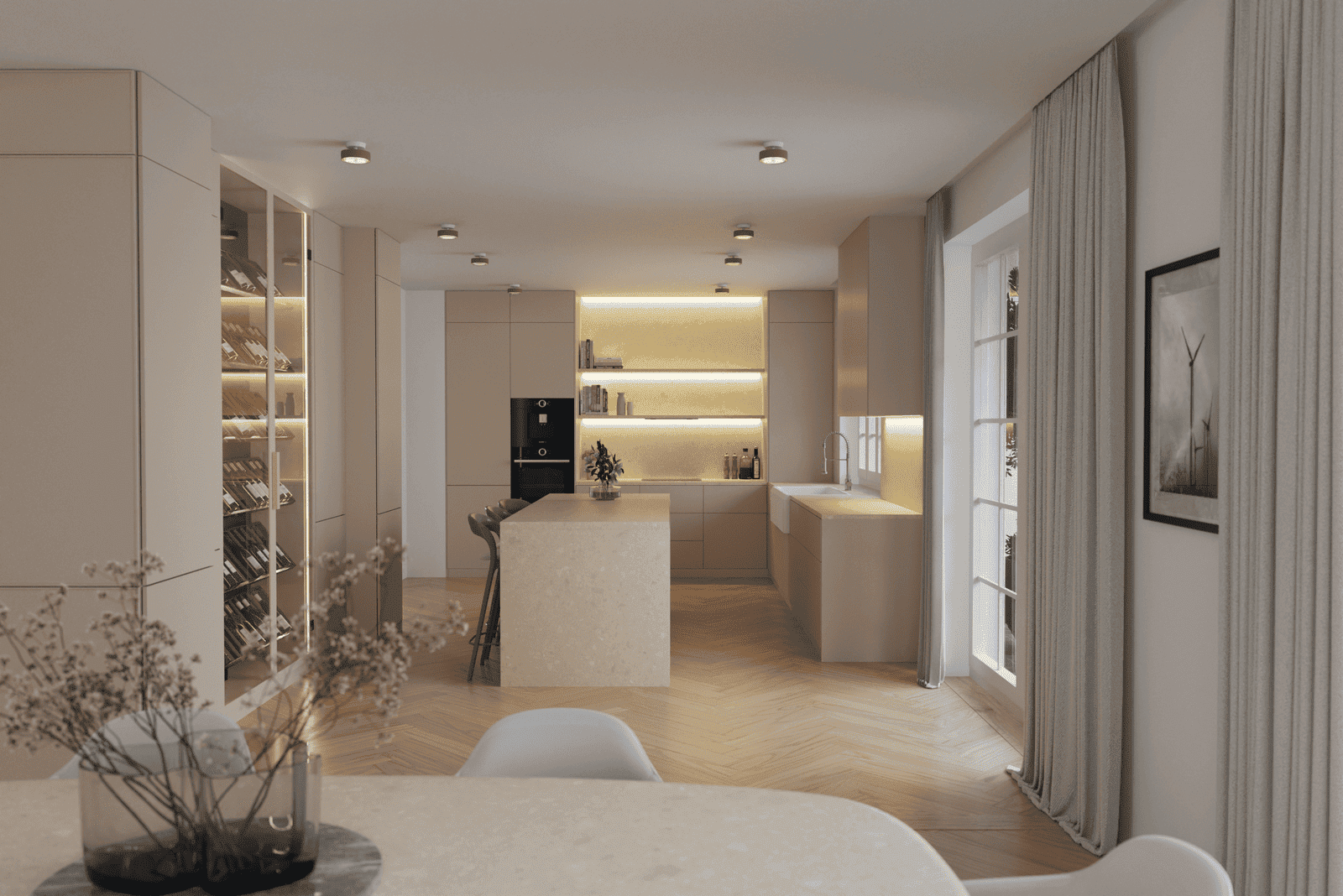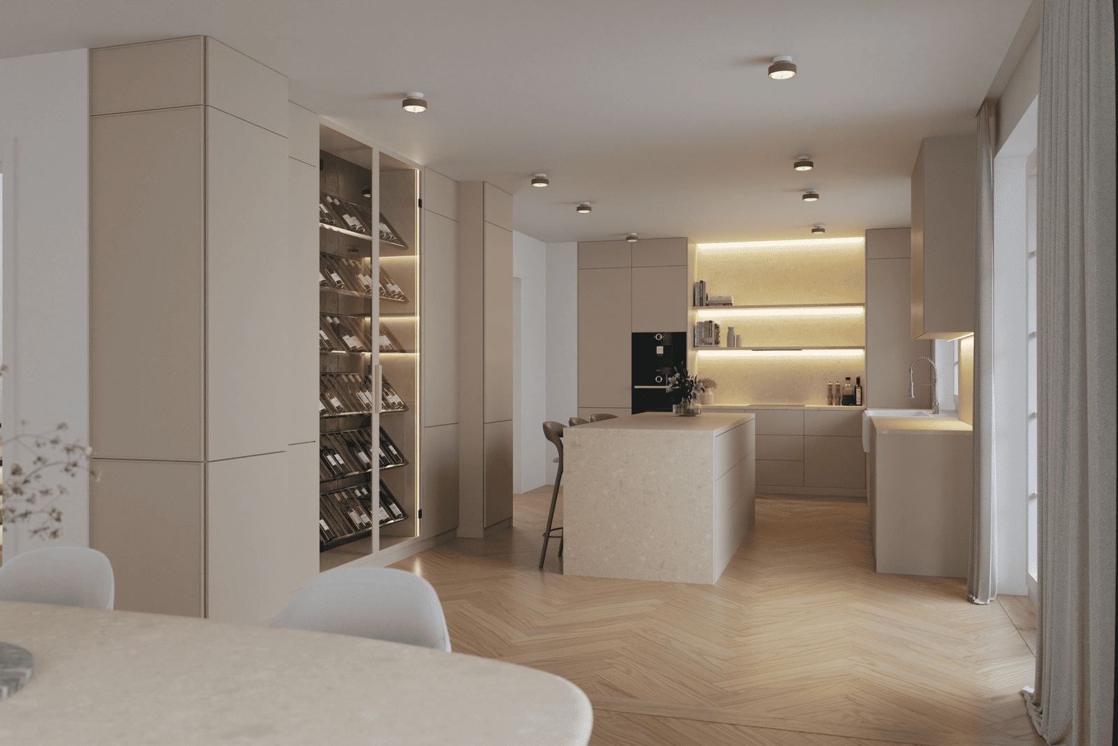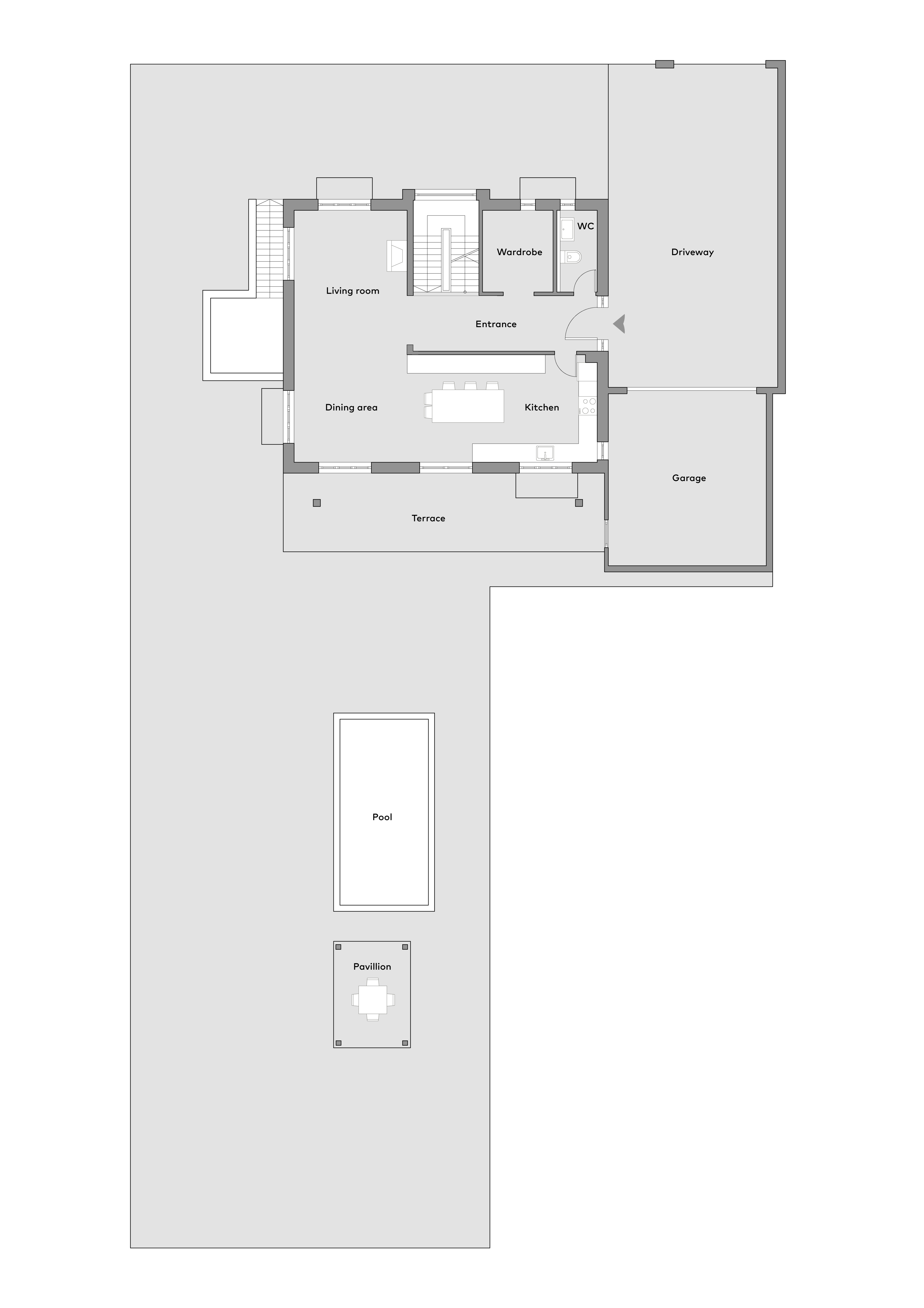 On the ground floor, you are welcomed by a spacious entrance area with a custom-made wardrobe and guest WC. The light-filled living and dining area opens up with floor-to-ceiling windows to the covered terrace and the lovingly designed expansive garden, pool, and covered patio. Noble oak parquet floors, high-quality fine stoneware tiles, and hand-plastered walls underscore the premium quality. The open kitchen is equipped with state-of-the-art features, custom-built furnishings, and high-quality branded appliances – the perfect meeting point for the whole family.