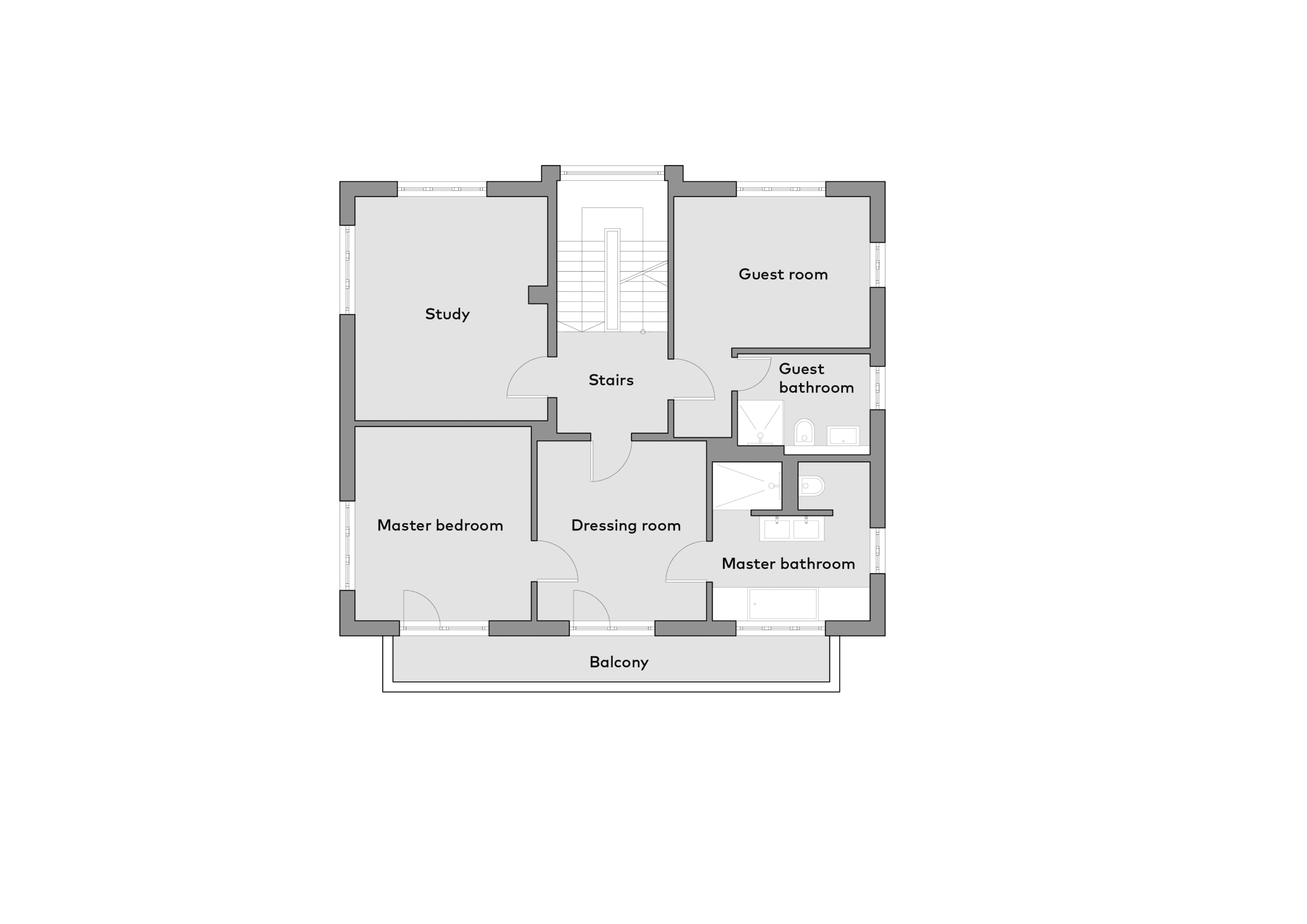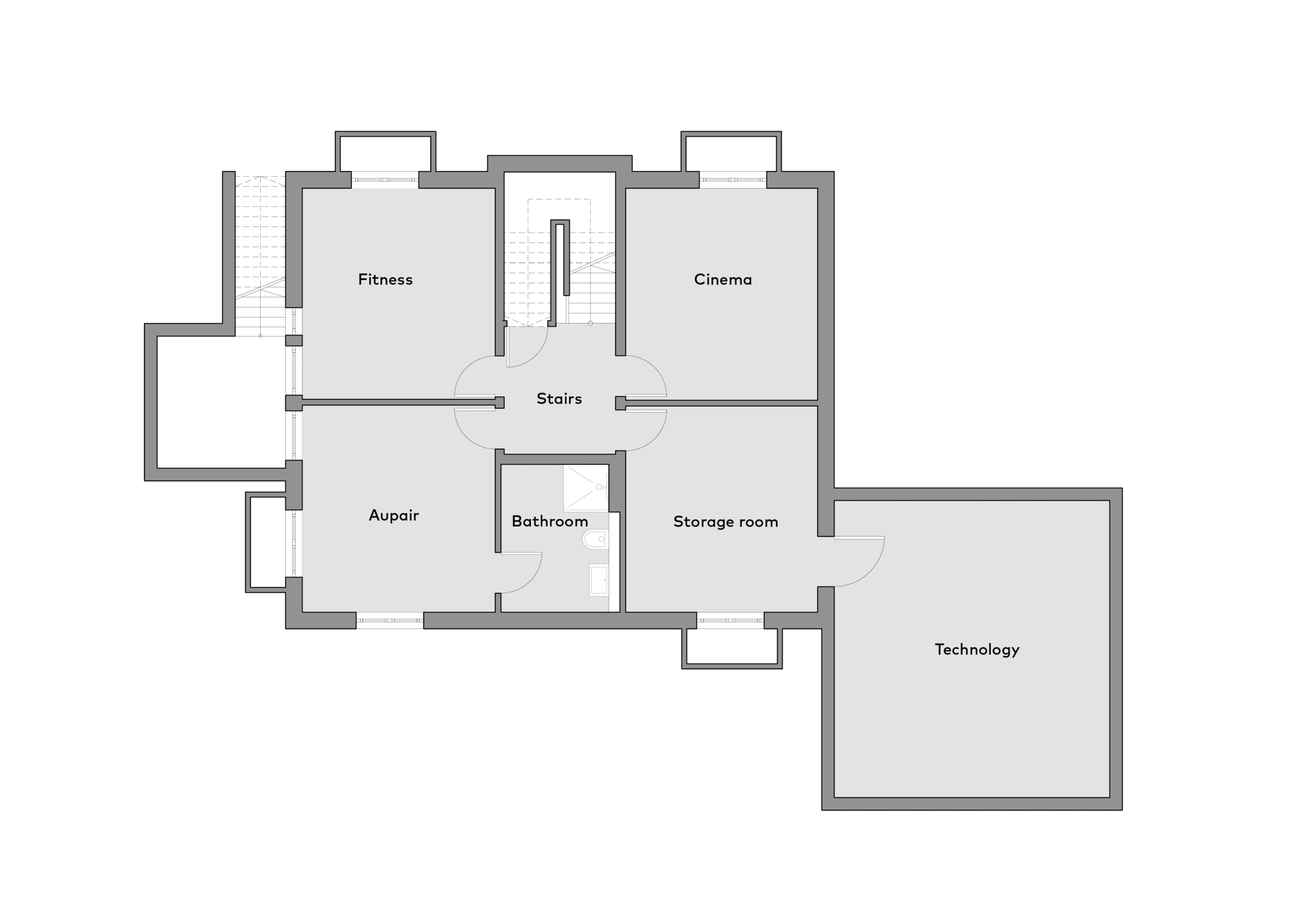 Six bright and friendly designed bedrooms, a separate guest room, and a functional study offer generous retreats with a lot of privacy. In the bright basement of the house, which is also equipped with large floor-to-ceiling windows, there is space for a kind of apartment or a separate guest area, alongside a home theater, sauna, and gym. The building techno- logy is centrally and efficiently planned, with underfloor heating in all rooms, smart controls for lighting and climate, as well as high-quality security systems.