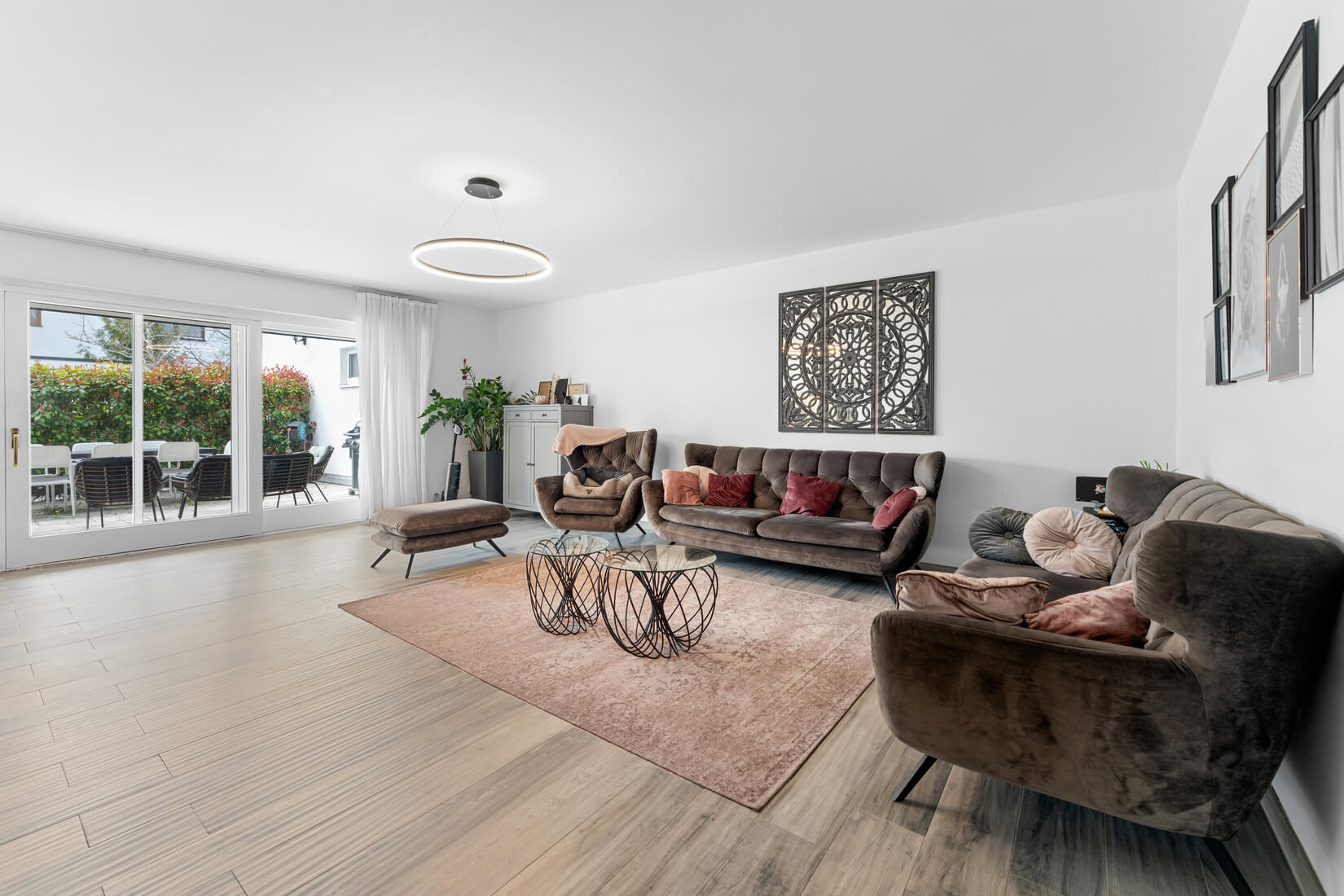 The apartment impresses with its solid and contemporary furnishings, which make everyday life pleasant. The entrance area is fitted with high-quality marble flooring, while robust tiles with a laminate look create a homely atmosphere in the living area. The spacious kitchen offers good technical equipment with NEFF and Gaggenau appliances as well as practical seating. Two flexibly usable children’s or study rooms perfectly complement the space on offer. The master bedroom is separated from the living area by a sliding door, which provides additional privacy. A spacious bathroom with a floor-level shower and large-format tiles rounds off the features. Electric shutters, underfloor heating and insect screens further enhance living comfort.