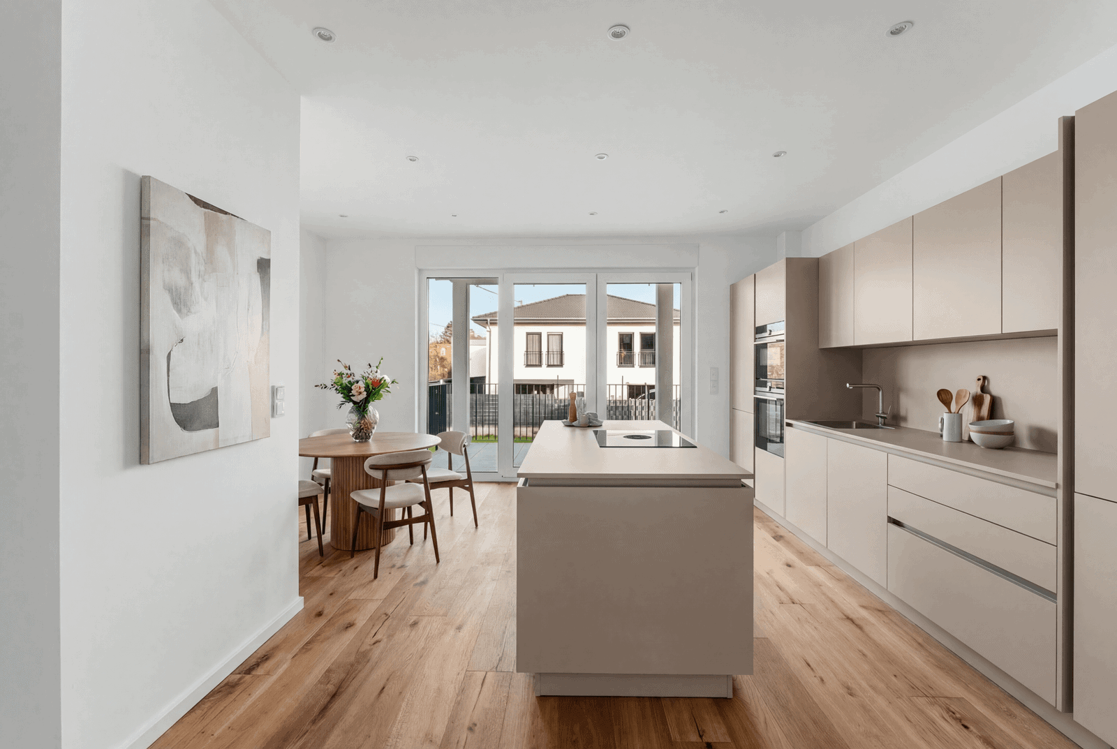 In an exclusive setting of just 11 residential units, you can enjoy the benefits of a manageable and well-organised owners’ association. Privacy is a top priority here. Thanks to the integrated passenger lift, access to your new home is completely step-free and designed for comfort – a key advantage for long-term owner-occupation or for ensuring the property remains attractive to a discerning tenant market. The heart of the flat is the open-plan living and dining area, which flows seamlessly onto the spacious balcony. Large windows and generous ceiling heights create a light-filled ambience that conveys both freedom and a sense of security.
