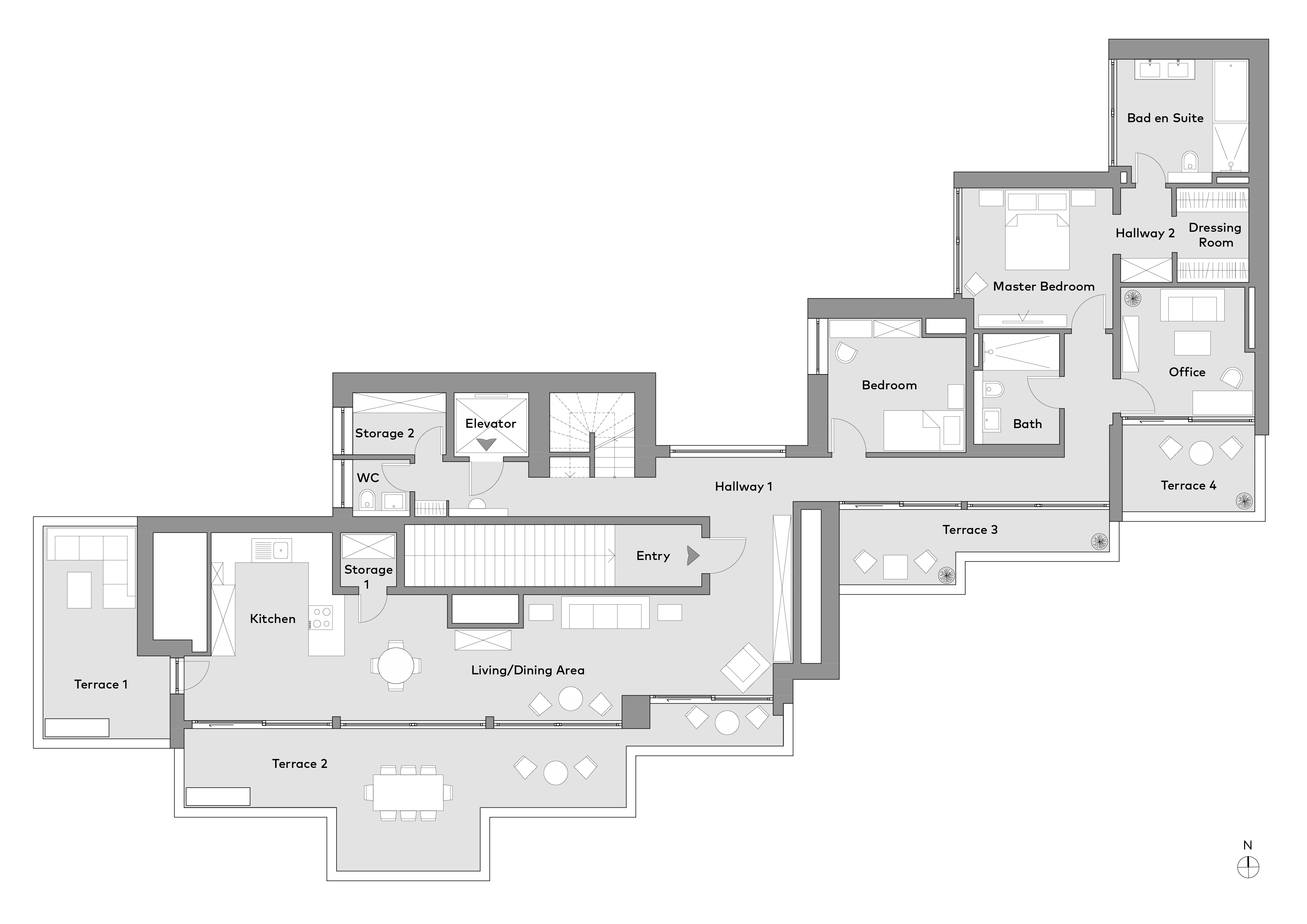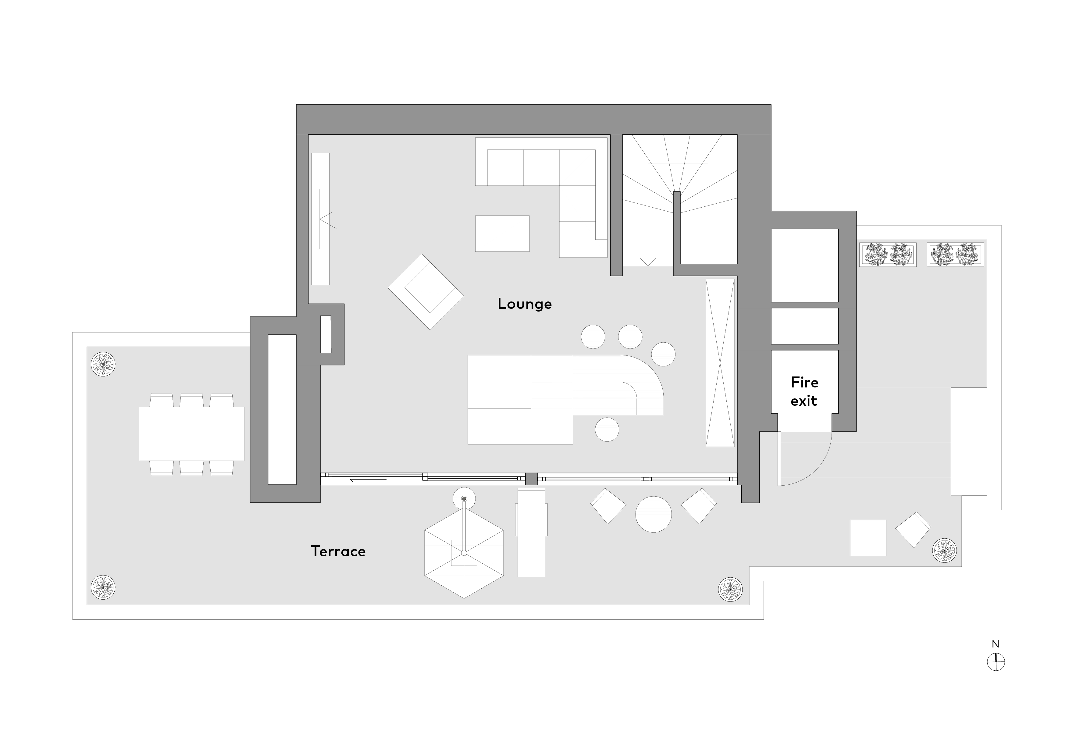 The flat impresses with first-class fittings and maximum comfort. A key-operated passenger lift provides direct and convenient access to the flat. Inside, custom-made Italian designer furniture and a high-quality fitted kitchen from Marquardt Küchen, equipped with German brand appliances such as an induction hob with integrated extractor fan from Miele, are impressive. Next to the kitchen is a storage room including a fridge. The bathrooms are tiled with natural slate and have floor-to-ceiling rain showers and additional towel radiators. There is also a separate guest WC. On the upper floor, a cosy lounge with its own bar and open fireplace invites you to relax. The terraces are paved with stone slabs and have outside water connections and all-round outside lighting. An approx. 15 m² basement room with its own lighting and sockets, as well as a further storage room with a ceiling height of 3 metres on the 5th floor offer ample storage space.