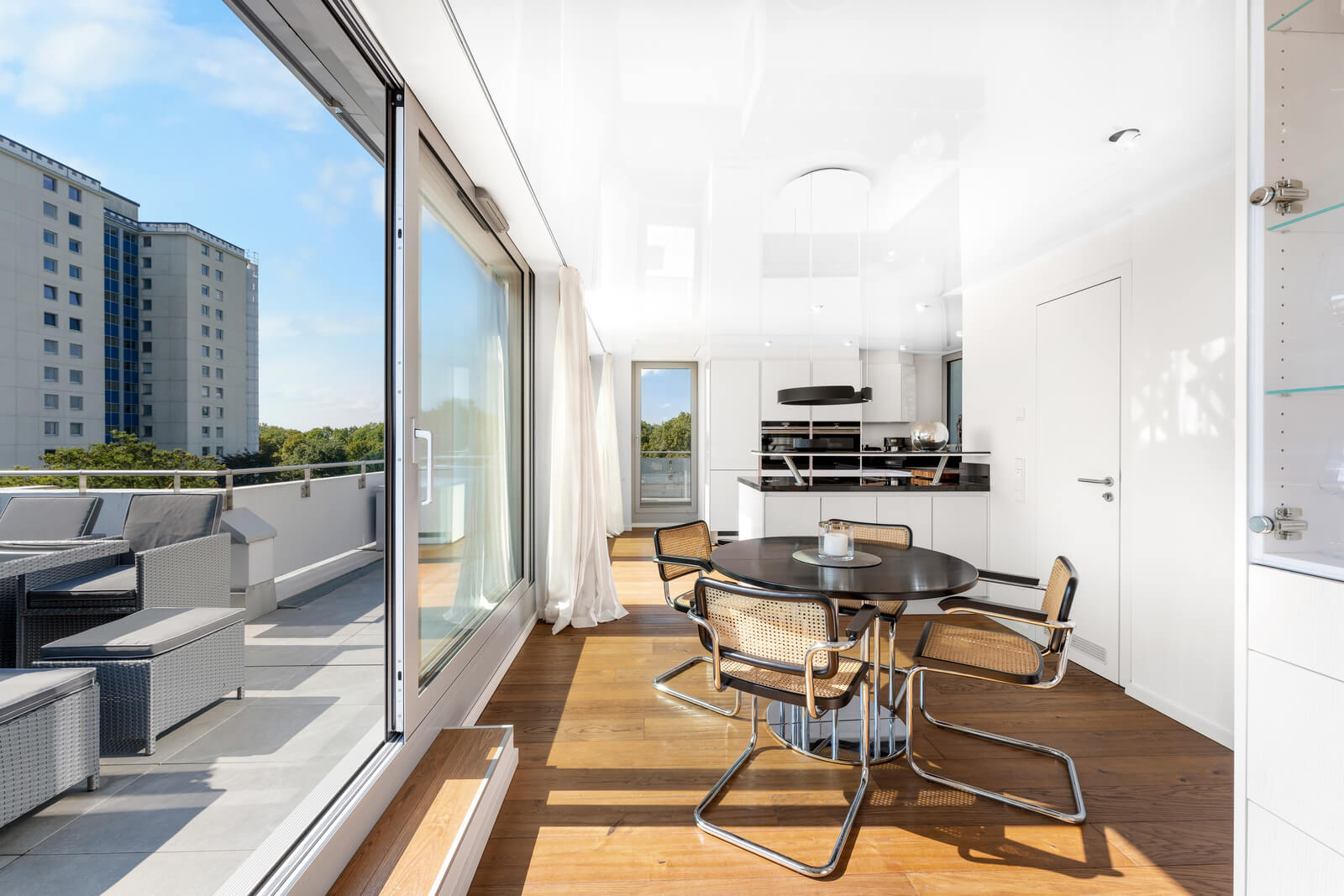 This exclusive penthouse maisonette flat, built in 2018, is located in Bogenhausen, one of Munich’s most sought-after locations. The flat extends over the 6th and 7th floors and offers an exceptional living experience on approx. 228 m² of living space.
