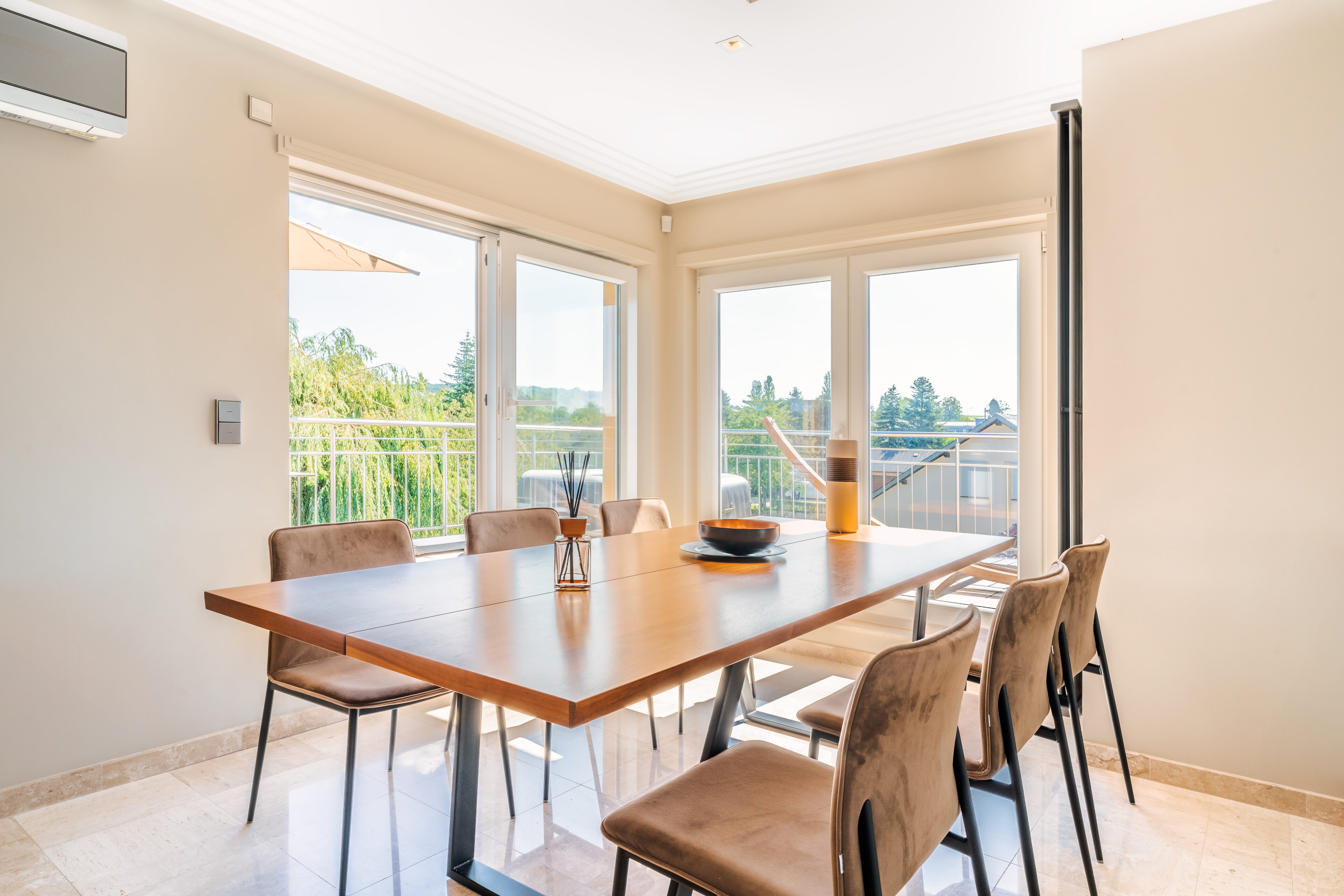 On the second floor is an impressive living room of over 50 sqm with a dining area and open kitchen that seamlessly flows into the living area. From there, you can access another spacious balcony connecting the interior and exterior.