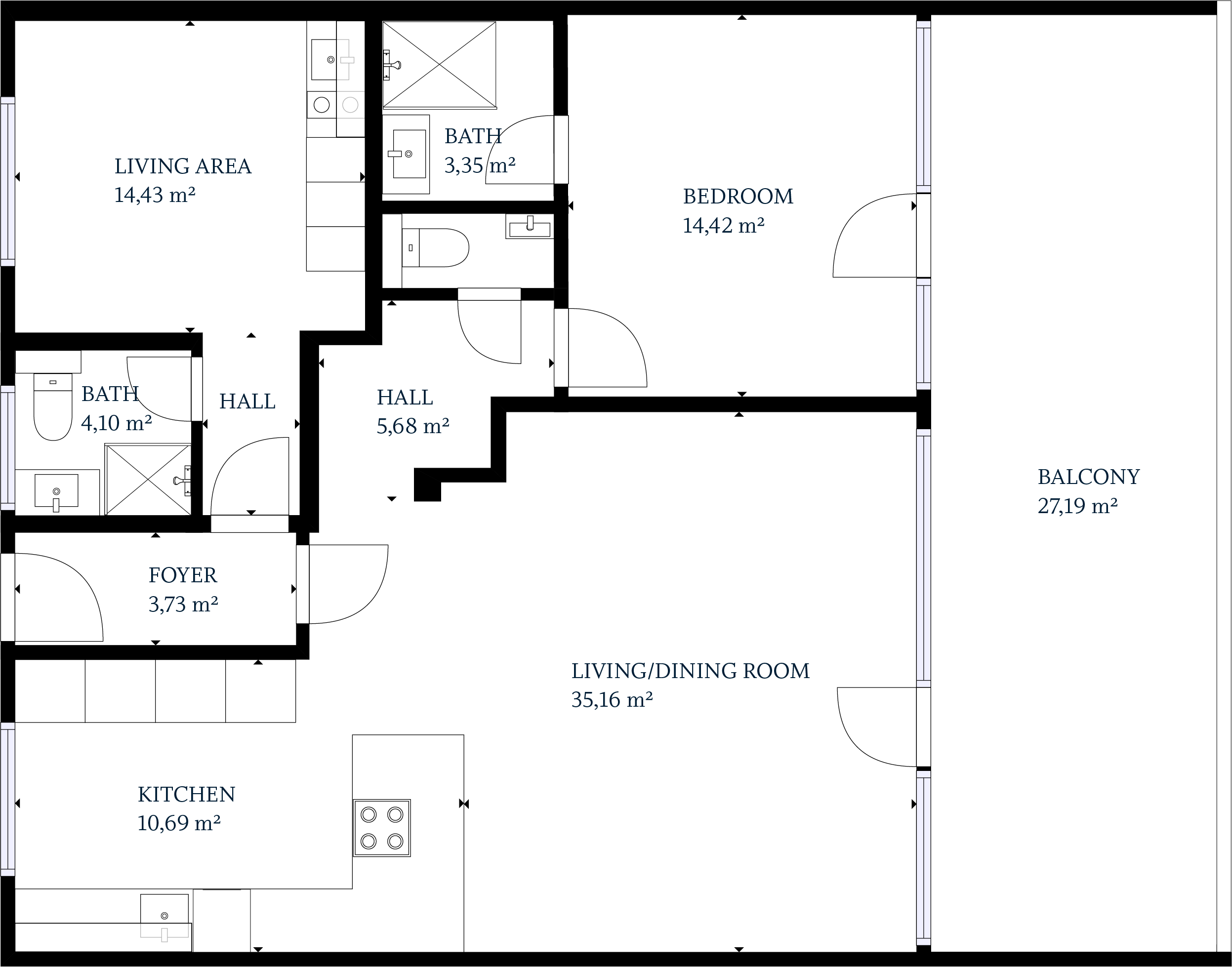 The apartment is equipped with premium, stylish furniture. It boasts a fitted kitchen will all amenities. The living room is also furnished; it comes with a comfortable corner couch, a coffee table, additional seating and a large television for welcome moments of relaxation. The master bedroom has a double bed, a wardrobe and a table. . Both the apartment and the studio have an entrance area that opens up into each of the rooms. The combined living/dining area in the studio is equipped with a fitted wardrobe, a high-quality, pull-out couch and a kitchen. It is therefore completely autonomous and can be used as a separate unit.