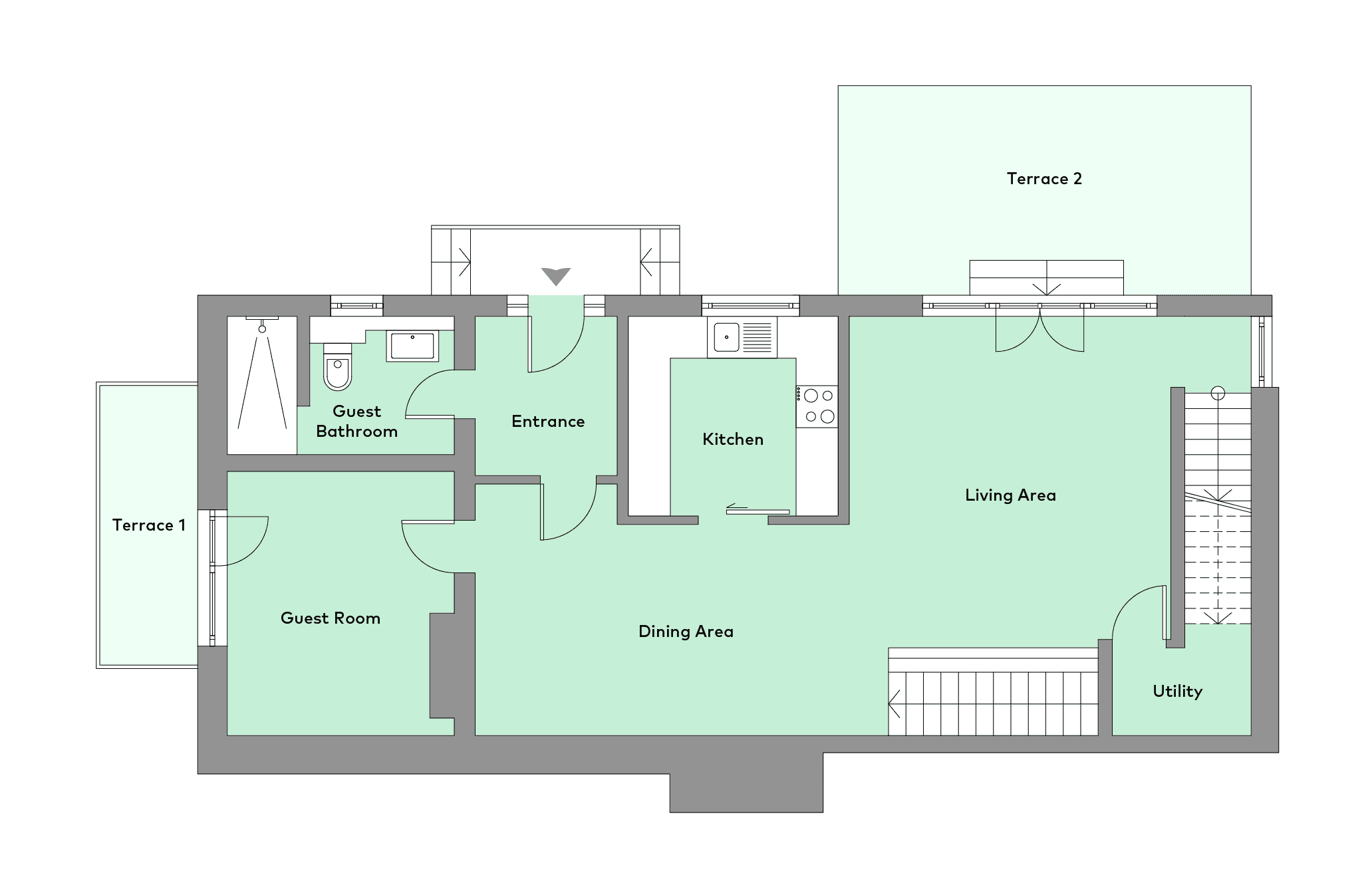 The apartment has practical and solid fittings that make everyday life comfortable. There is a modern video intercom system in the entrance area. The spacious, U-shaped fitted kitchen is well equipped and offers plenty of space for cooking and eating together. A beautifully designed natural stone staircase with indirect lighting leads to the upper floor, where there is a spacious bedroom with access to a second terrace and a bathroom with shower and bathtub. In addition, floor-to-ceiling windows, electric shutters, underfloor heating and insect nets ensure pleasant living conditions. The space is practically complemented by a garden shed for storage.