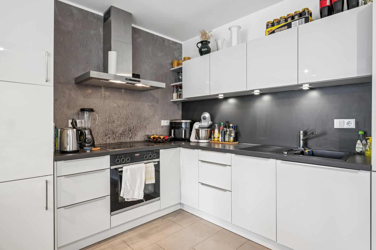 The modern shower room has a towel radiator and a washing machine connection. A modern fitted kitchen blends harmoniously into the overall design and is included in the purchase price.